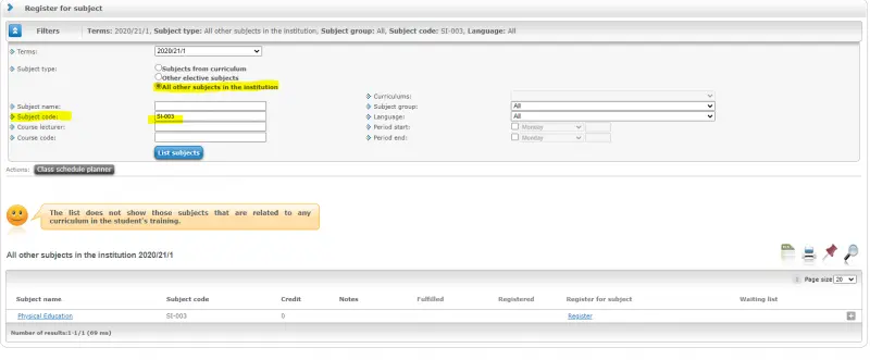 Register for Subjects > Select "All subjects of the institution" + type "SI-003" under "Code" > List > select "Physical Education" > "Register" > select from the listed courses.