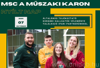MSc Nyílt Napra várja a mesterképzés iránt érdeklődőket a Debreceni Egyetem Műszaki Kara október 7-én. A keddi rendezvényen a kar vezetői mellett több volt hallgató és az Emerson | NI képviselője is ismerteti majd a mesterképzés előnyeit.