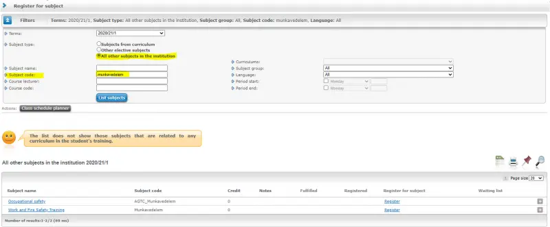 You can find the course on Neptun under: Subjects > Register for subject > Subject from curriculum, or in the case of an older curriculum "All other subjects in the institution" (see below).